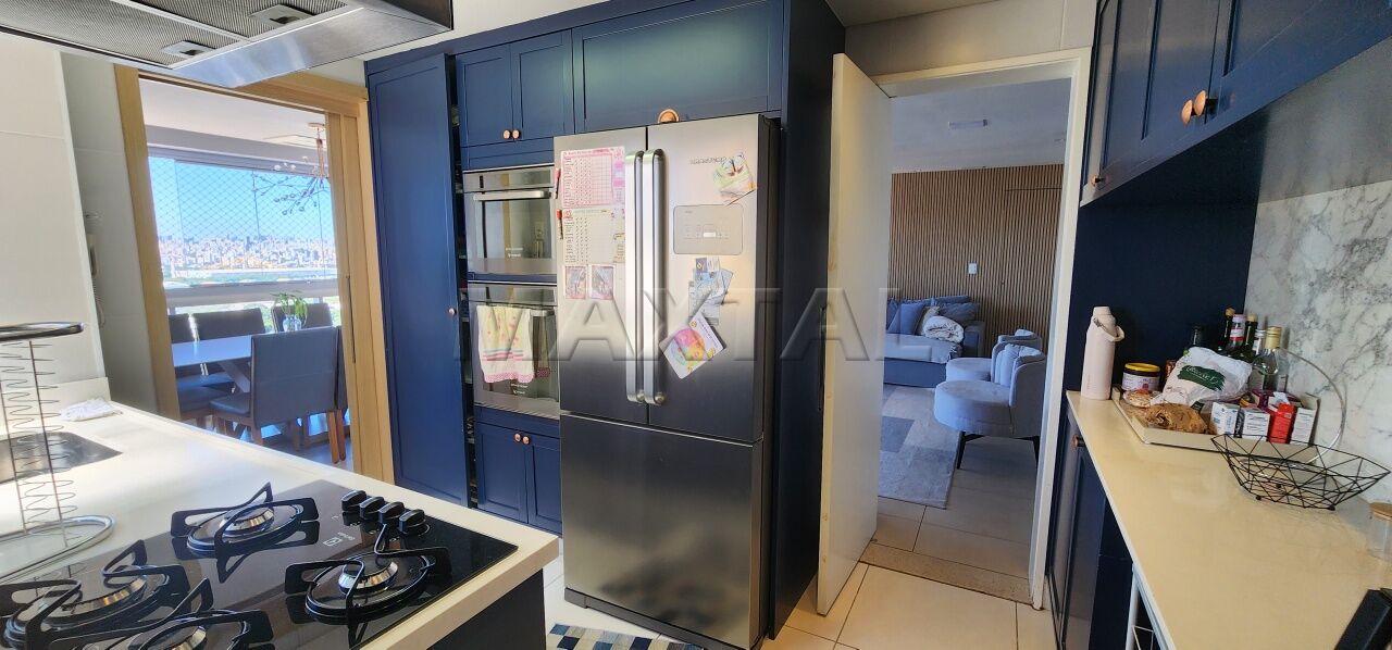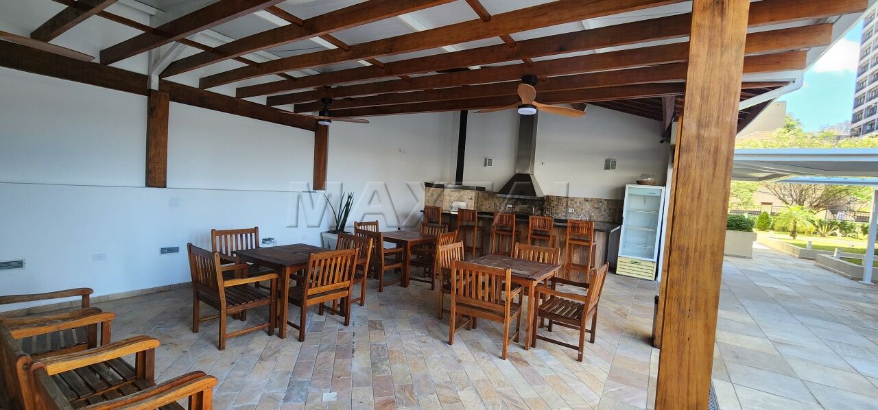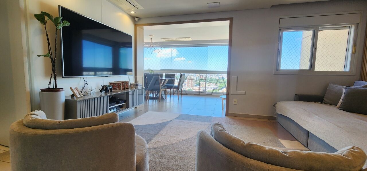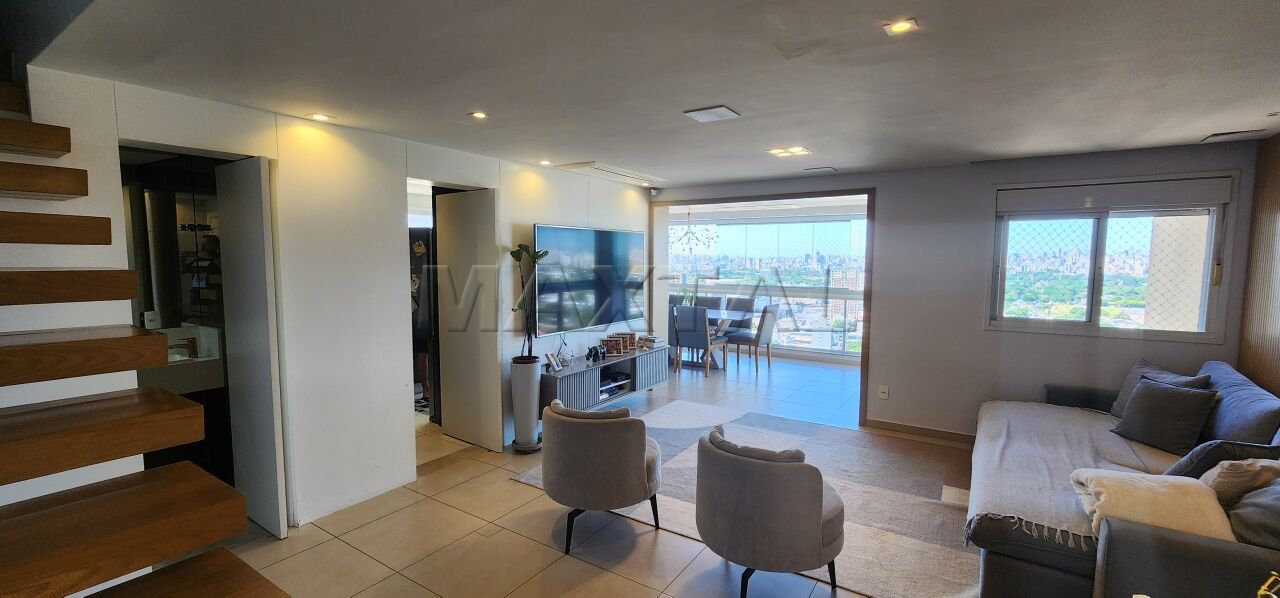 A sala de estar é integrada a um amplo terraço com churrasqueira e balcão de preparo, proporcionando uma vista privilegiada de 180 graus do Campo de Marte e panorâmica da cidade.